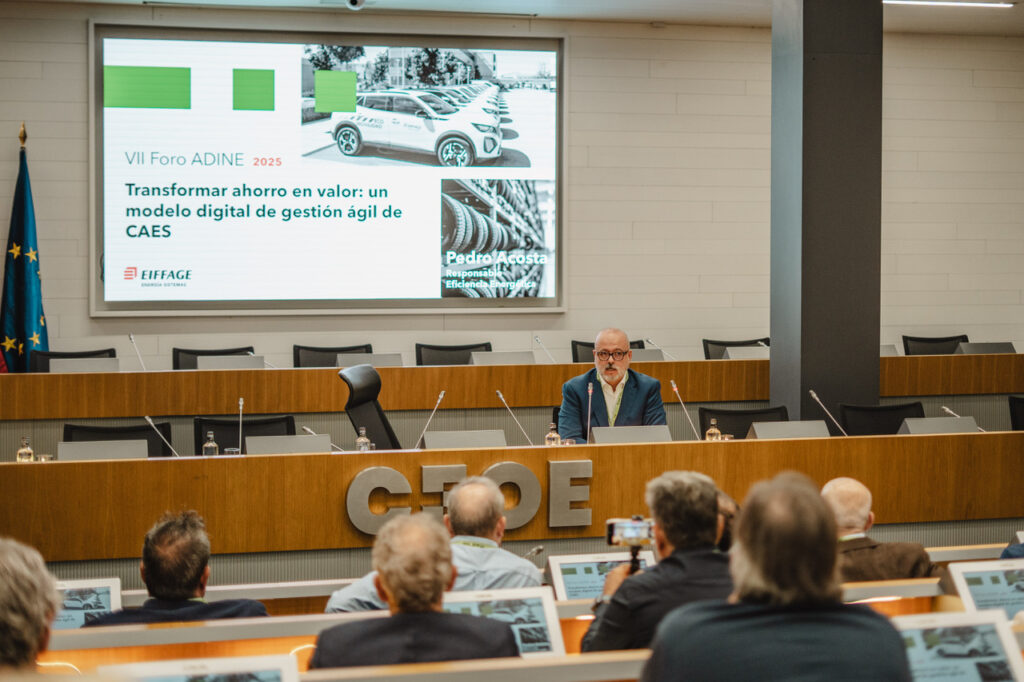 Pedro Acosta (Eiffage Energía Sistemas) expuso un modelo digital de gestión ágil para los CAES (Certificados de Ahorro Energértico) en los neumáticos, una herramienta relevante para que talleres y empresas puedan cumplir los objetivos de eficiencia energética regulados recientemente y que supone un incentivo para los usuarios al sustituir sus neumáticos por otros de mayor eficiencia energética en la resistencia a la rodadura.