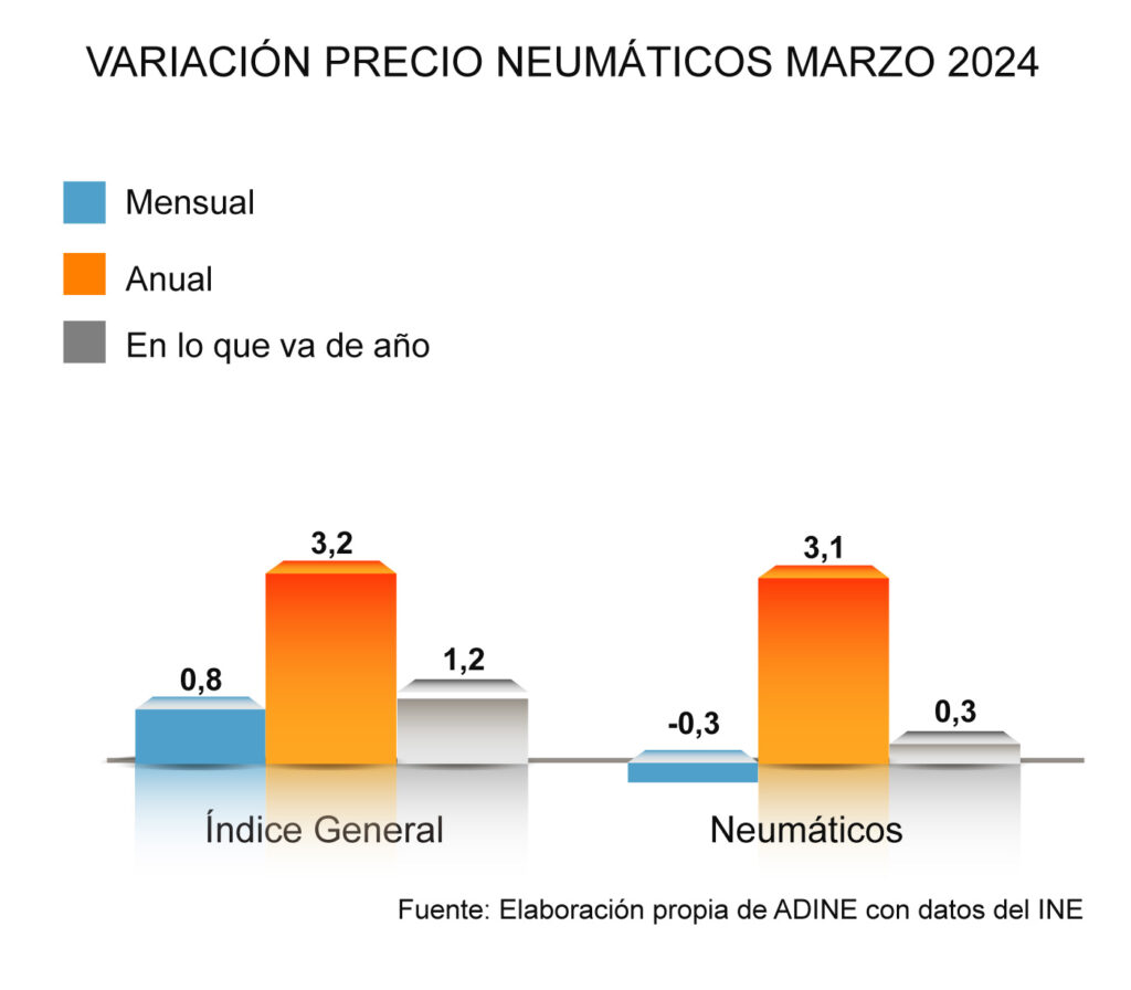 El precio de los neumáticos cerró marzo con una tasa interanual del 3,1% , lo que representa un descenso del 0,9% respecto al 4% de febrero, según un estudio elaborado por la Asociación Nacional de Distribuidores e Importadores de Neumáticos (ADINE) basado en los datos publicados por el Instituto Nacional de Estadística (INE).