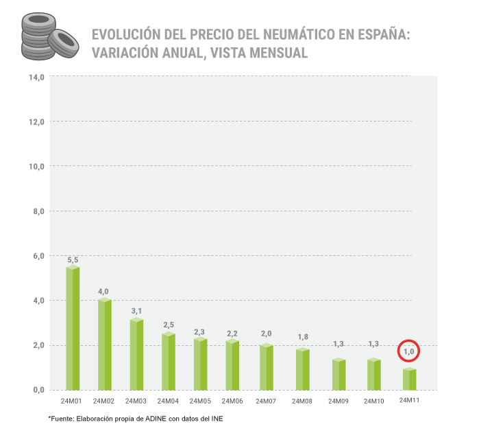 El descenso en la tasa interanual de noviembre deja el precio de los neumáticos 1,4 puntos porcentuales por debajo del Índice de Precios al Consumo (IPC) general, que se situó en el 2,4% durante el mes de noviembre.