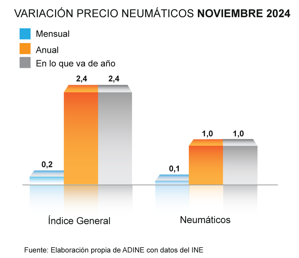 Por otro lado, el estudio de ADINE destaca que, en comparación con octubre, el precio de los neumáticos registró un incremento mensual del 0,1%, mientras que el IPC general subió un 0,2% en el mismo período.