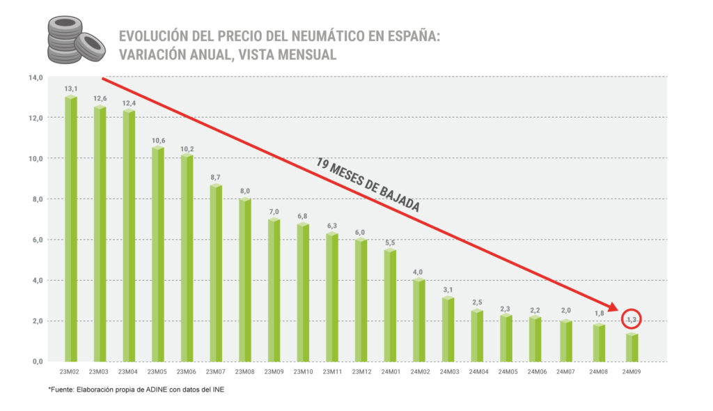 El precio de los neumáticos registró en septiembre una tasa de variación interanual del 1,3%, acumulando así diecinueve meses consecutivos de descensos. Esta cifra supone una caída de cinco décimas respecto a agosto, cuando la tasa fue del 1,8%, según un estudio elaborado por la Asociación Nacional de Distribuidores e Importadores de Neumáticos (ADINE) a partir de datos del Instituto Nacional de Estadística (INE).