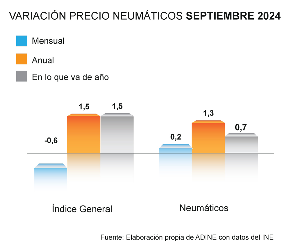Por otro lado, el informe de ADINE señala que, en comparación con el mes anterior, los precios de los neumáticos aumentaron dos décimas en septiembre, mientras que el IPC general experimentó una variación mensual del -0,6%.
