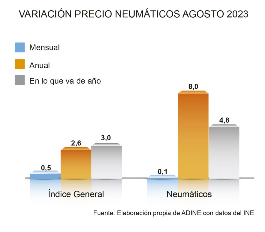 El precio de los neumáticos continúa moderando su inflación y se sitúa en agosto en el 8%, según un estudio llevado a cabo por la Asociación Nacional de Distribuidores e Importadores de Neumáticos (ADINE) en base a los datos publicados por el Instituto Nacional de Estadística (INE).