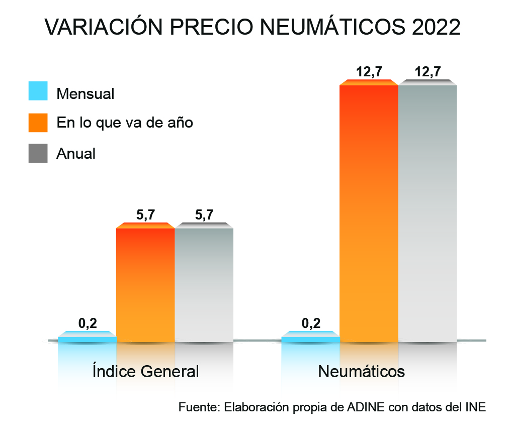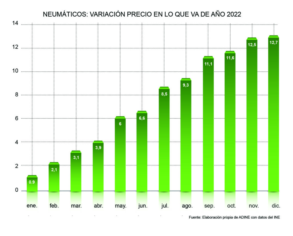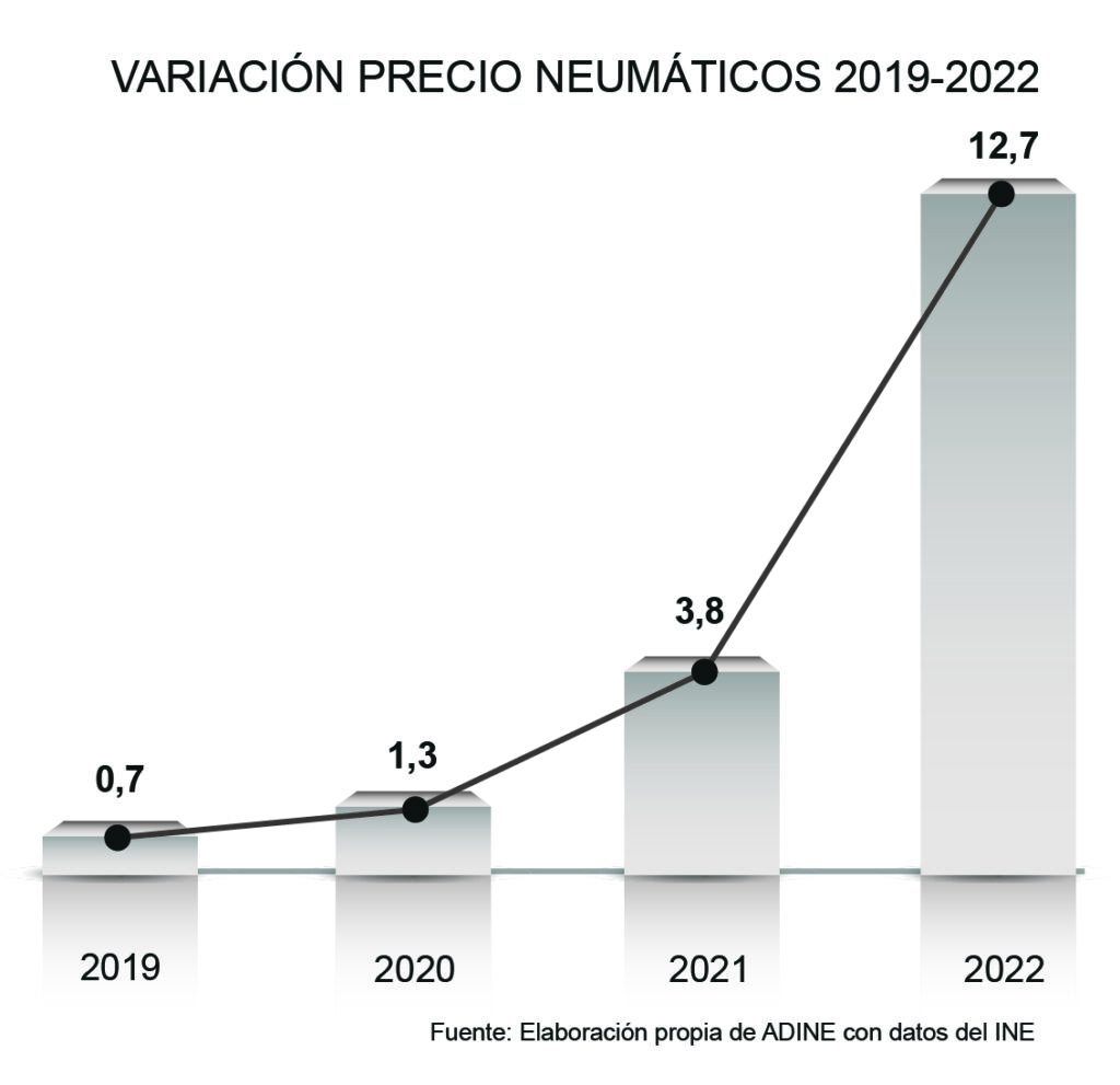 El precio de los neumáticos se encareció un 12,7% en 2022, según un estudio elaborado por la Asociación Nacional de Distribuidores e Importadores de Neumáticos (ADINE) en base a datos del Instituto Nacional de Estadística (INE)