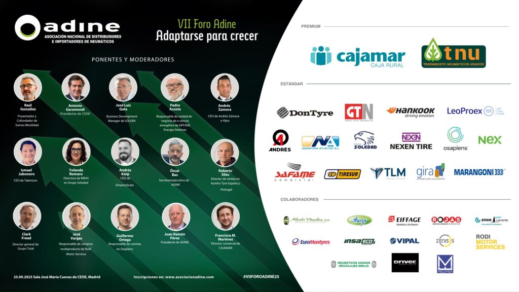 El VII Foro ADINE está dirigido a todos los actores del sector del neumático: asociados y no asociados, fabricantes, distribuidores, importadores, redes de talleres, gestores autorizados de residuos, profesionales de la posventa, asociaciones, administraciones y proveedores interesados en participar y generar oportunidades de networking.